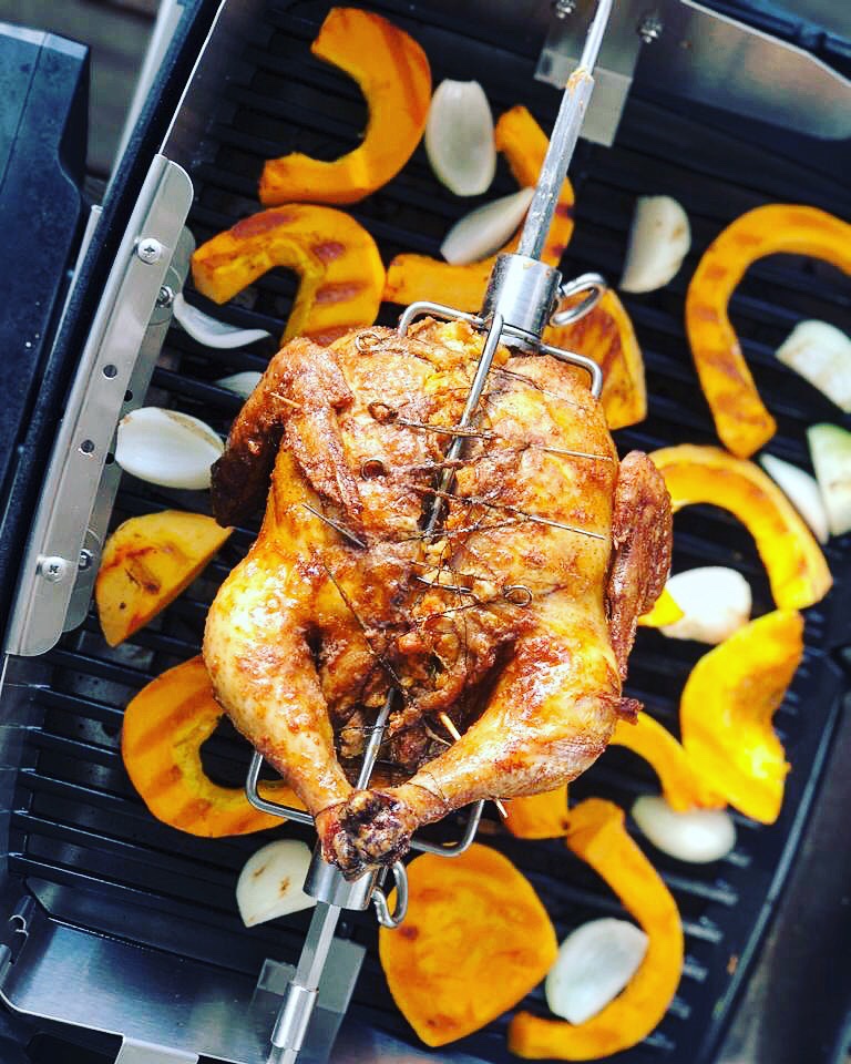 In der Zwischenzeit das Huhn auf den Drehspieß geben. Sobald der Grill die Temperatur erreicht hat, das Drehspieß mit dem Huhn einspannen und für 2 Stunden grillen.