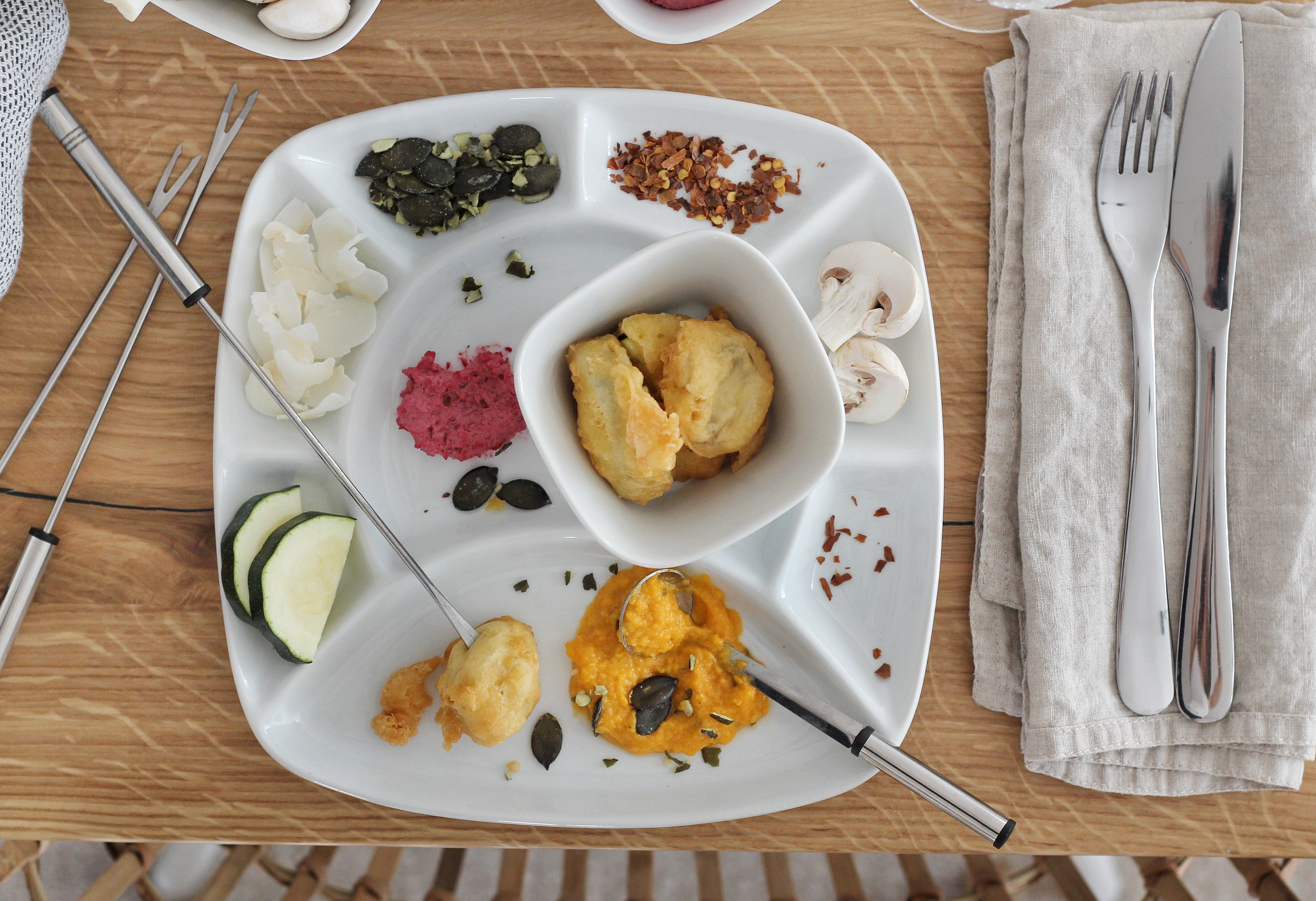 Vegetarisches Fondue                                           Gemüse im Backteig mit Kürbis Hummus und Rauna Dip