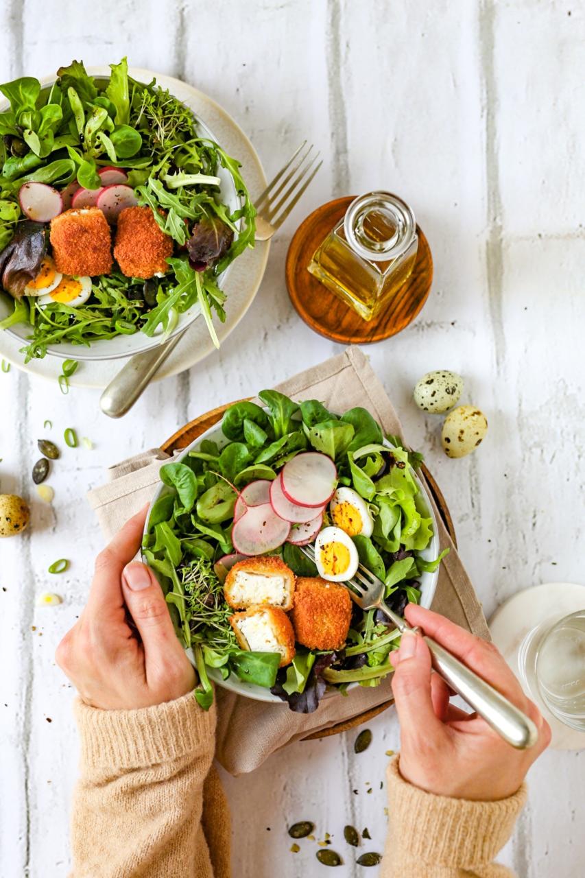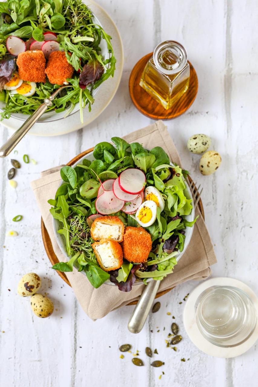 - Für die knusprigen Feta-Würfel den Käse in ca. 3x3 cm große Stücke schneiden.Die Käsewürfel nun in Mehl, Ei und Dinkel Semmelbrösel wenden. Damit der Käse beim Backen nicht ausläuft ein zweites Mal in Ei und Dinkel Semmelbrösel wenden.Öl in einer Pfanne erhitzen und die Feta Würfel bei mittlerer Hitze goldgelb backen.In der Zwischenzeit den Salat waschen, die Radieschen putzen und in Scheiben schneiden. Eier schälen und vierteln. Anschließend auf vier tiefen Tellern anrichten.Für das Dressing Apfelessig, Kernöl, Honig, Senf, Salz und Pfeffer verrühren und über den Salat gießen.Die knusprigen Feta-Würfel auf dem Salat anrichten und mit Kürbiskernen bestreuen.TIPP: Für mehr Abwechslung kann man verschiedenen Kräuter, wie z.B. Oregano, Thymian oder Rosmarin, mit den Dinkel Semmelbröseln mischen.