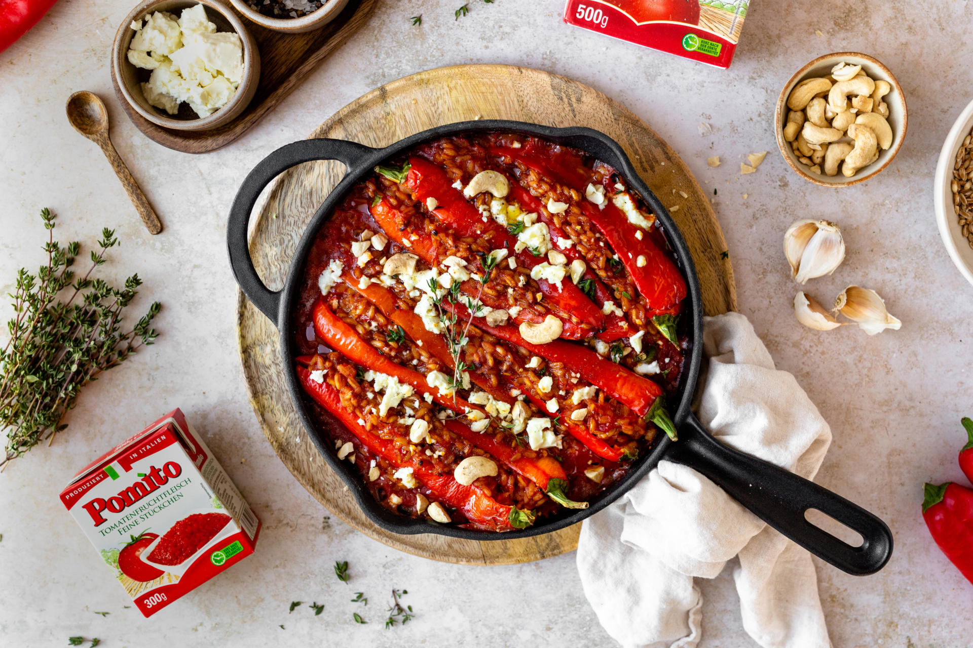 - Für die Füllung, Zwiebel sowie Knoblauch abziehen und fein hacken.Olivenöl in einem Topf erhitzen, Zwiebel und Knoblauch goldbraun rösten.Dinkelreis zugeben und für einige Minuten, unter ständigem Rühren, mitbraten.Tomatenmark und Tomatenfruchtfleisch feine Stückchen einrühren.Thymian zugeben und mit Gemüsesuppe aufgießen. Auf kleiner Flamme für ca. 20 Minuten köcheln lassen.Für die Sauce Zwiebel und Knoblauch schälen, fein hacken und in etwas Olivenöl anrösten.Mit passierten Tomaten und Tomatenfruchtfleisch feine Stückchen aufgießen, eine Prise Muskatnuss zugeben und auf kleiner Flamme 15-20 Minuten köcheln lassen.In der Zwischenzeit die Spitzpaprika der Länge nach auf, aber nicht durchschneiden. Kerngehäuse und feine weiße Häute entfernen.Den Backofen auf 180 Grad Heißluft vorheizen.Die Sauce in eine ofenfeste Form geben.Spitzpaprika mit je 3-4 Esslöffel Tomaten-Dinkelreis füllen und in die Sauce legen.Zugedeckt im Backofen für ca. 30 Minuten schmoren. Den Deckel von der Form nehmen, mit Feta-Käse bestreuen und für weitere 5-10 Minuten bei 200 Grad überbacken.Cashewnüsse grob hacken.Die gefüllten Paprika aus dem Backofen nehmen, mit gehackten Cashewnüssen bestreuen und genießen.