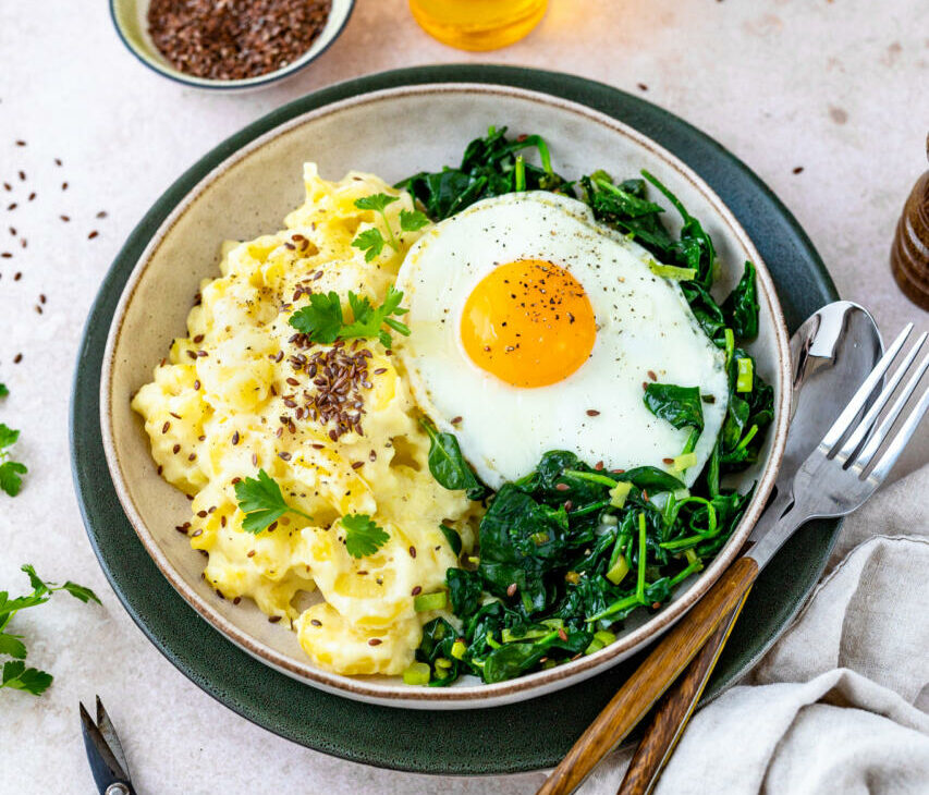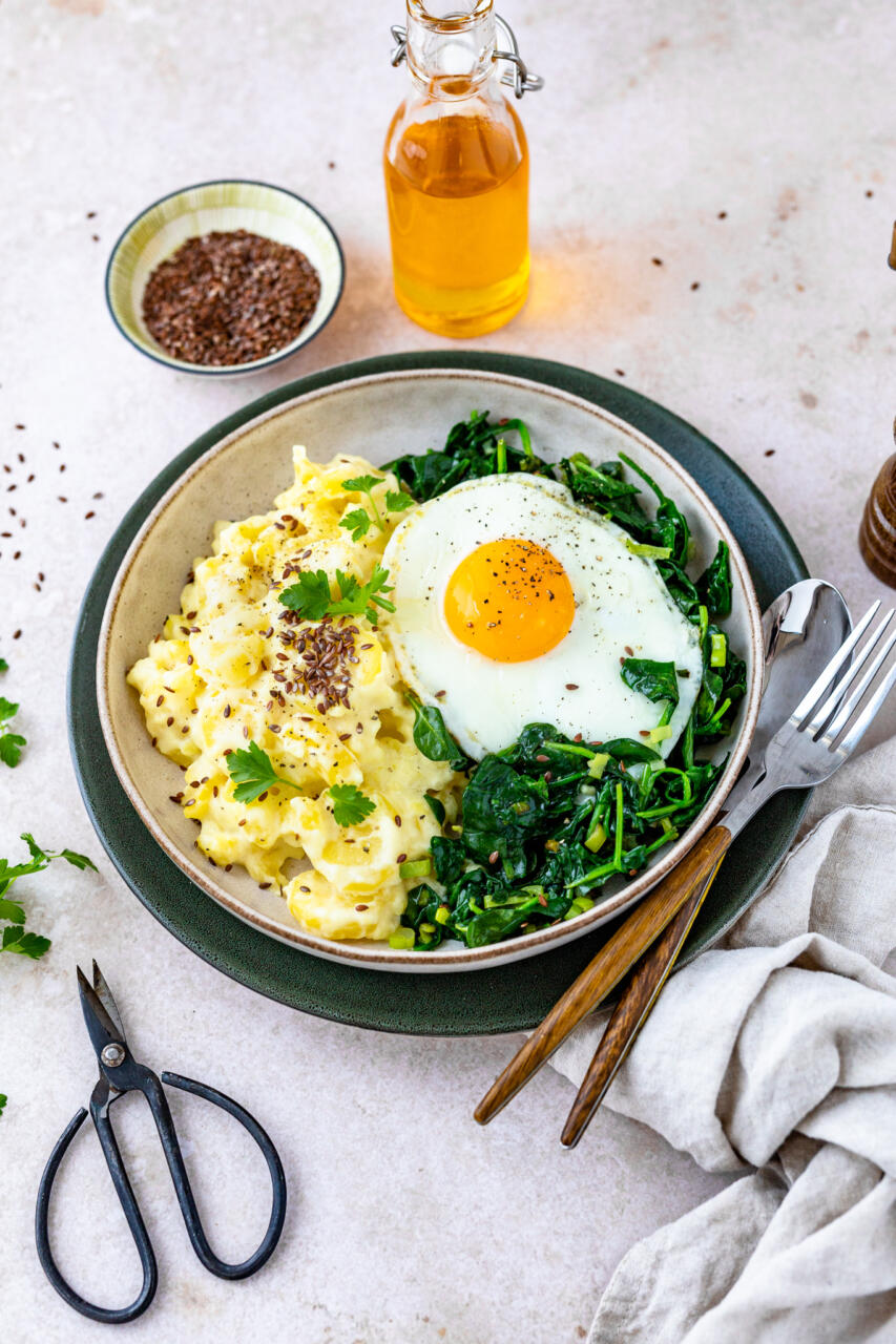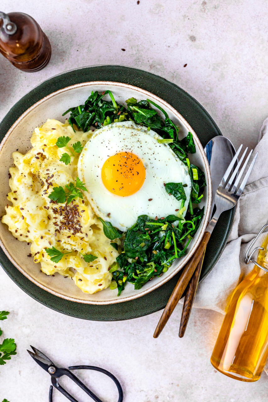 - Kartoffeln in der Schale weich garen.In der Zwischenzeit den Spinat waschen, abtropfen lassen und grob hacken. Frühlingszwiebeln in feine Ringe schneiden. Knoblauchzehen schälen und sehr fein würfeln.Öl in einer Pfanne erhitzen, Frühlingszwiebeln farblos anbraten. Spinat sowie Knoblauch zugeben. Au kleiner Flamme weiterbraten bis der Spinat zusammenfällt und warmhaltenDie Kartoffeln schälen und in Scheiben schneiden. Milch mit einer zerdrückten Knoblauchzehe in einem Topf aufkochen. Kartoffelscheiben sowie eine Prise Salz zugeben. Rühren, bis die Kartoffeln die Milch aufgenommen haben. Butter in einer Pfanne erhitzen und die Spiegeleier braten. Sobald die Kartoffeln die Milch aufgenommen haben, zwei Esslöffel Sauerrahm sowie Leinöl zugeben und unterrühren.Leinöl Erdäpfel, Spinat und Spiegeleier anrichten. Die Erdäpfel mit Leinsaaten toppen und das Spiegelei mit frischem Pfeffer würzen.