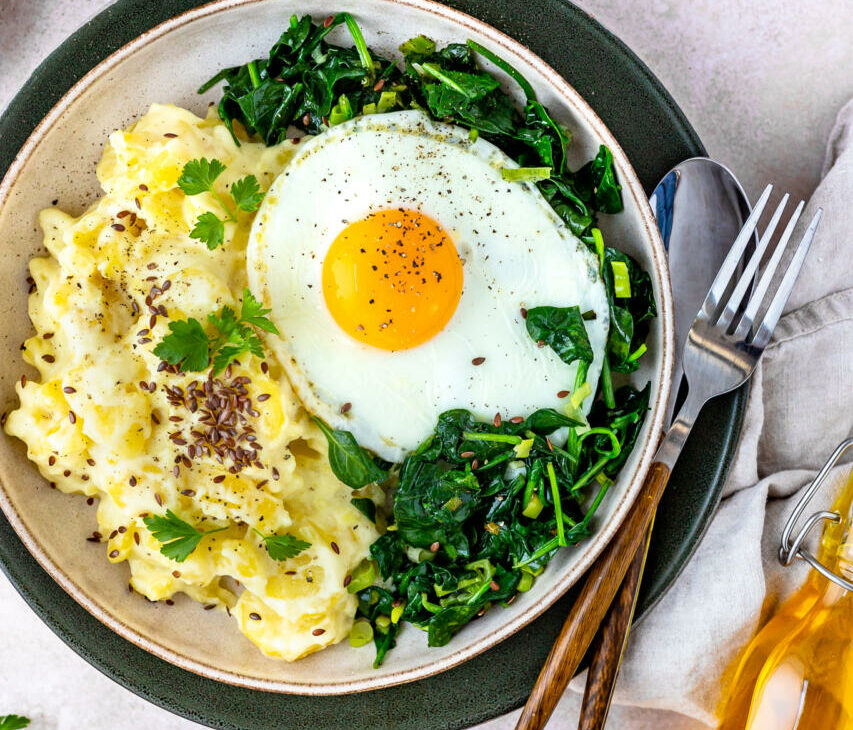 Aus Liebe zu meiner Region kochen wir traditionelle Mühlviertler Leinöl Erdäpfel mit Spinat und Spiegelei!