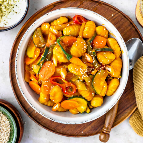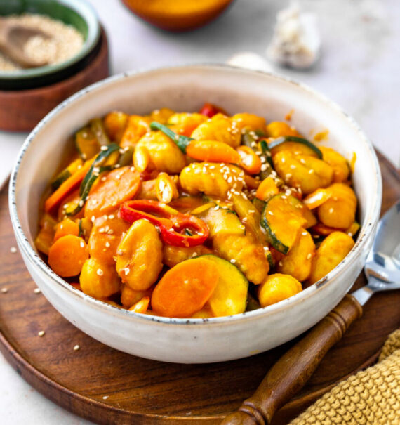Wir reisen um die Welt! Heute trifft Italien auf Indien, zwei Länder mit vielen traditionellen Gerichten und Köstlichkeiten. Wir vereinen zwei der besten Gerichte aus beiden Küchen und kochen eine indische Gnocchi-Pfanne mit Gemüse.