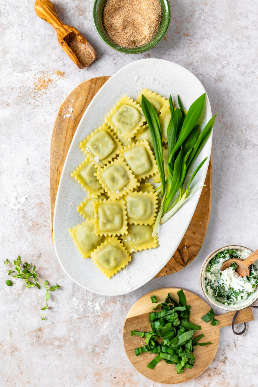 Natürlich kaufe ich auch Nudeln und mache sie nicht immer selber, aber bei Ravioli greife ich liebend gerne zur selbstgemachten Alternative. Die schmecken nicht nur super und sind schnell gemacht, sondern sind auch noch nach Lust und Laune befüllbar – heute eben mit frischem Bärlauch. Die Ravioli mache ich auch gerne auf Vorrat, so habe ich immer welche eingefroren und kann auch an stressigen Tagen leckere Ravioli für die ganze Familie machen!