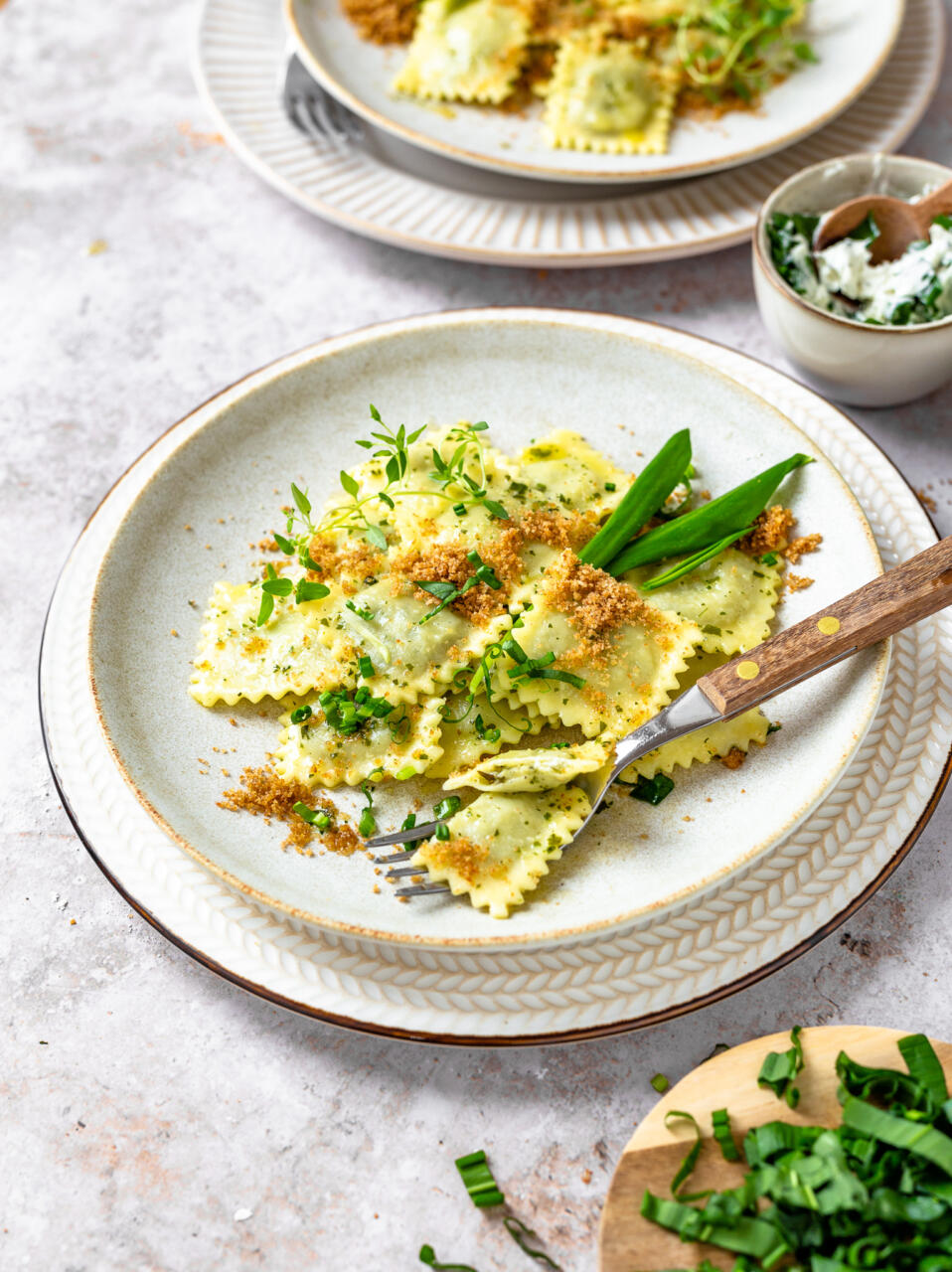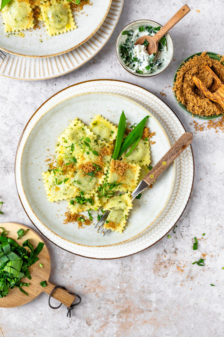 Ravioli mit einer frischen Füllung aus Bärlauch, Frischkäse und Vollkornbrösel zaubern Frühlingsgefühle PUR auf die Teller der ganzen Familie. Na los, probier auch Du diese Bärlauch-Ravioli aus!
