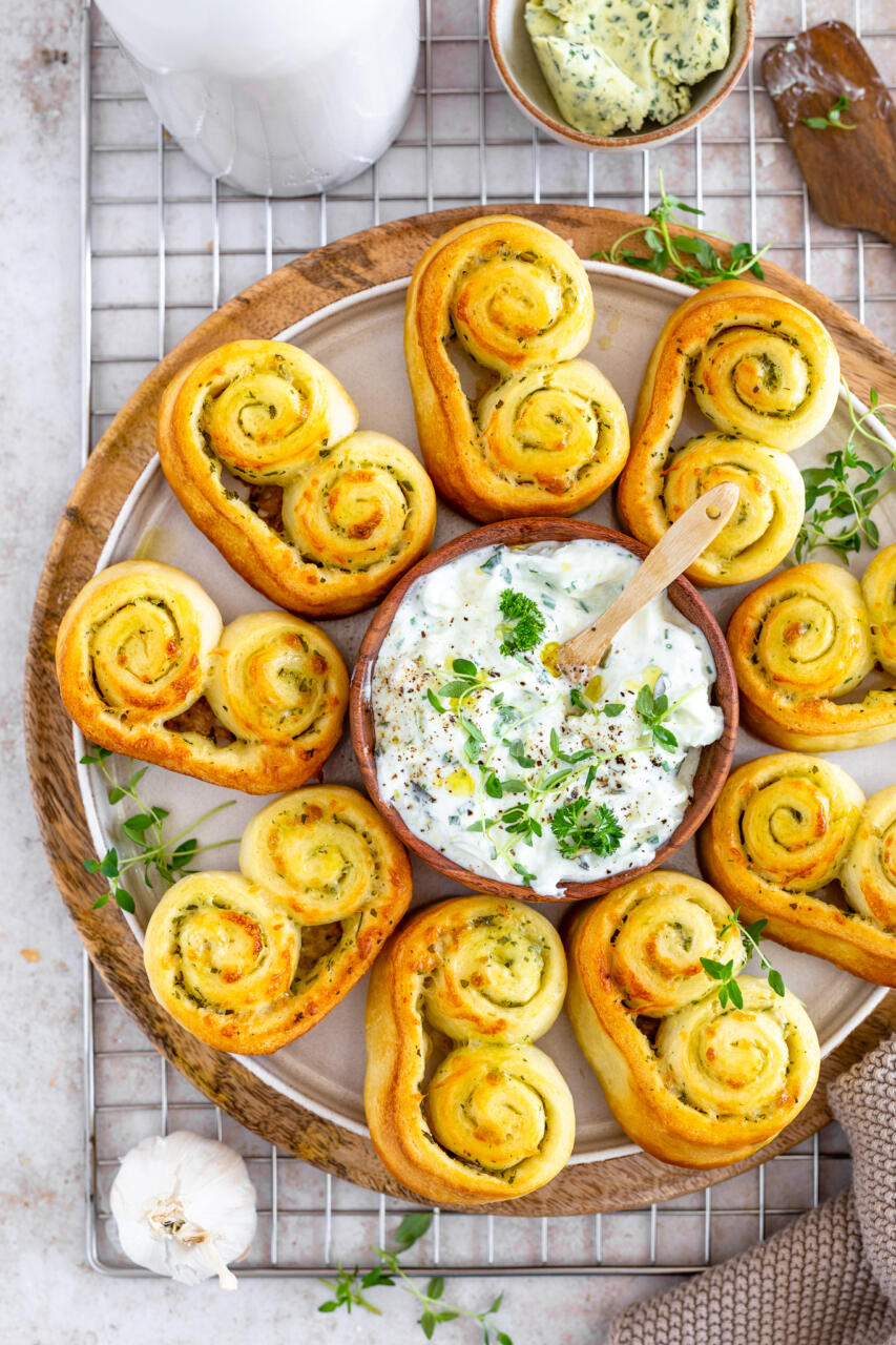 - Germ in lauwarmem Wasser auflösen. Dinkelmehl, Olivenöl sowie Salz zugeben und in der Küchenmaschen für 10 Minuten auf kleinster Stufe kneten. Abgedeckt für ca. 3o Minuten ruhen lassen. Gartenkräuterfein hacken und mit Butter sowie 2 zerdrückten Knoblauchzehen und Salzglattrühren.Backofen auf200 Grad Heißluft vorheizen. Den Teigrechteckig, ca. 5mm dick ausrollen. Mit Kräuterbutter bestreichen und mit Käsebestreuen. Anschließendvon beiden Seiten bis zur Mitte aufrollen. Mit einem scharfen Messer ca. 2cmbreite Scheiben abschneiden. Auf ein mitBackpapier belegtes Backblech geben, mit Olivenöl bepinseln und im vorgeheiztenBackofen für ca. 10-12 Minuten backen.