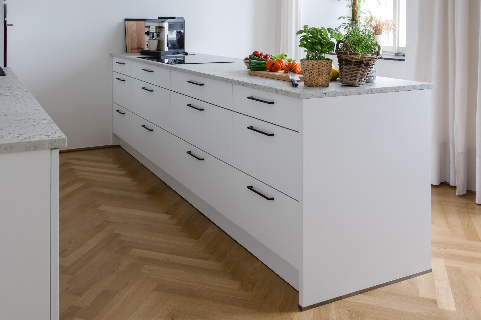 Auch hier ist es hilfreich die Auswahl mit einem Profi zu besprechen und sich auf die Erfahrungswerte zu verlassen. So habe ich mir z.B. eine schöne helle Arbeitsplatte, deren Optik sich nicht von Stein unterscheidet, widerstandsfähig ist und sich dennoch nicht negativ aufs Budget auswirkt, gewünscht.