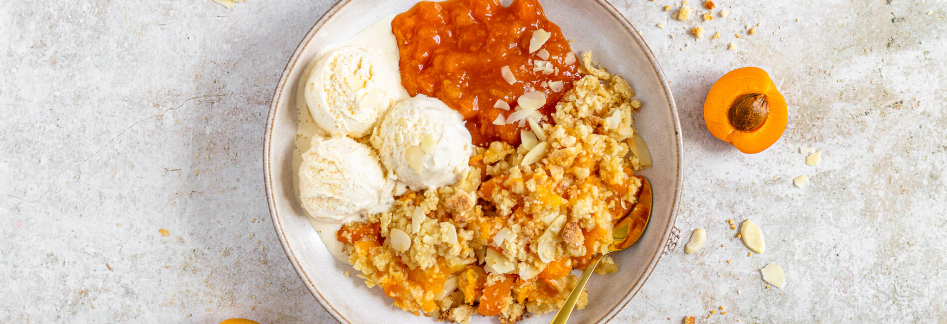 Bei meinem Marillen Crumble handelt es sich um keinen einfachen sondern um einen zweifachen Crumble! Das heißt wir schichten die Crumble Masse doppelt in die Form und haben so ein etwas „kuchigeres“ Erlebnis!