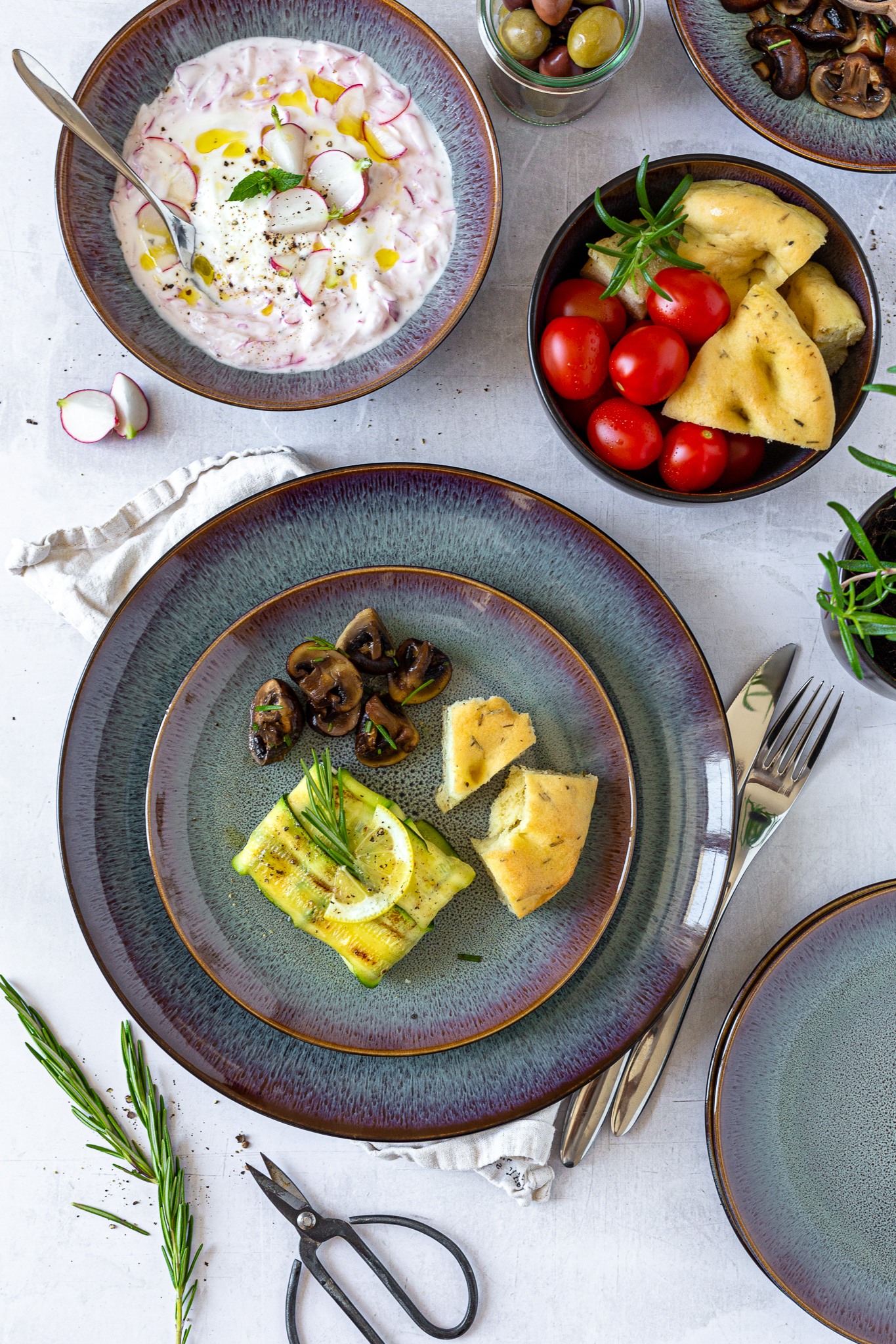 Zum Anrichten meiner Zucchini-Päckchen habe ich mich dieses Mal für ein glasiertes Geschirrset im Vintage-Look aus der Tafelgeschirr-Kollektion „Teona“ der Traditionsmarke MÄSER entschieden.