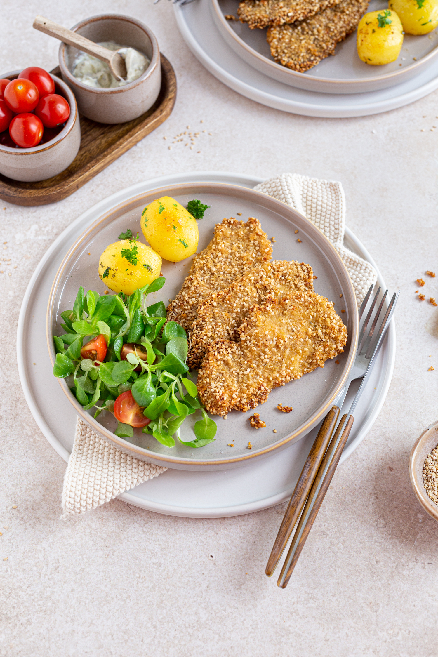 Neues Familienrezept dringend gesucht? Dann serviere ich euch gleich meine Hühner Sesam Schnitzel mit Petersilien-Kartoffeln!