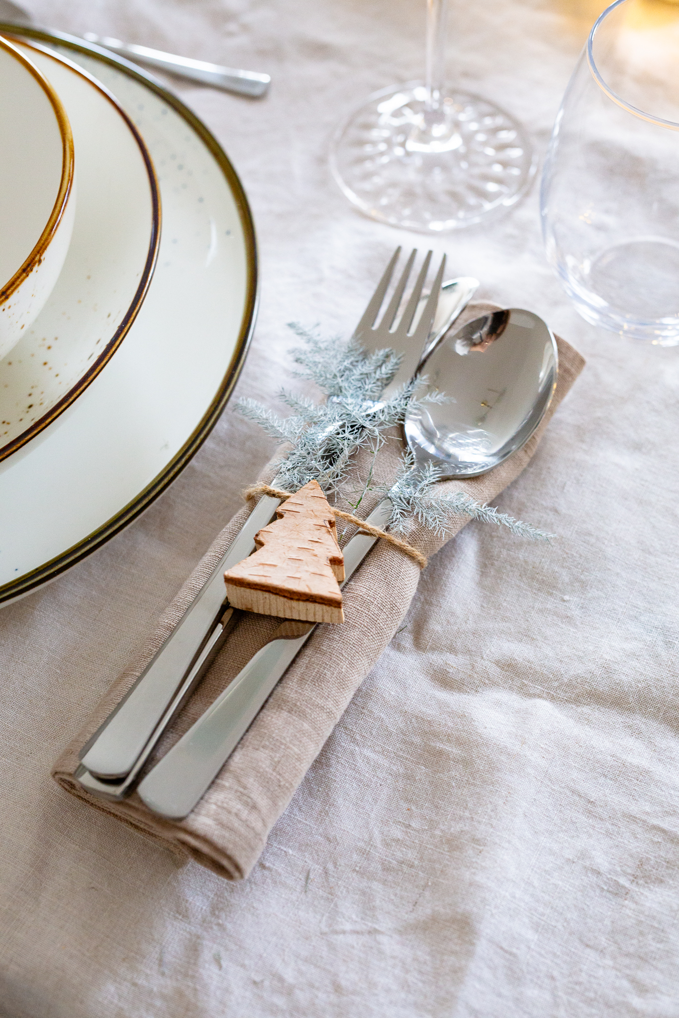 Verleihe deinem Tisch eine natürliche Note, indem du auf rustikale Elemente und frisches Grün setzt. Tannenzweige, Eukalyptus oder Mistelzweige sind perfekte Begleiter für eine natürliche, elegante Tischdeko. Kombiniere diese mit Holzaccessoires und rustikalem Geschirr für eine gemütliche Waldatmosphäre.