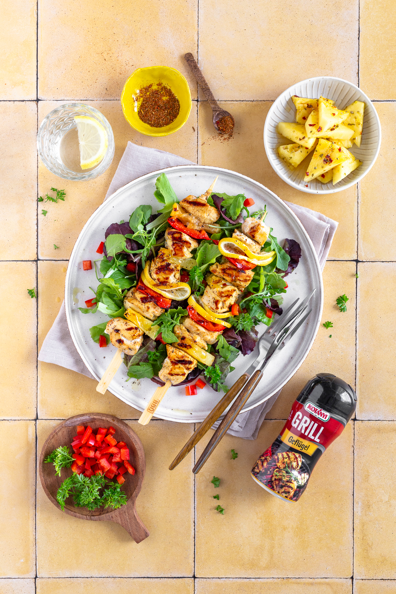Kotányi, bekannt für seine hochwertigen Gewürzmischungen, verleiht den Hawaii-Grillspießen eine einzigartige Note. Das Geflügel Gewürz von Kotányi ist perfekt abgestimmt und bringt das zarte Hühnerfleisch sowie die frische Ananas auf eine neue Geschmacksebene. Jeder Bissen ist eine Explosion aus süßem, würzigem und exotischem Geschmack – genau wie auf der Insel selbst.