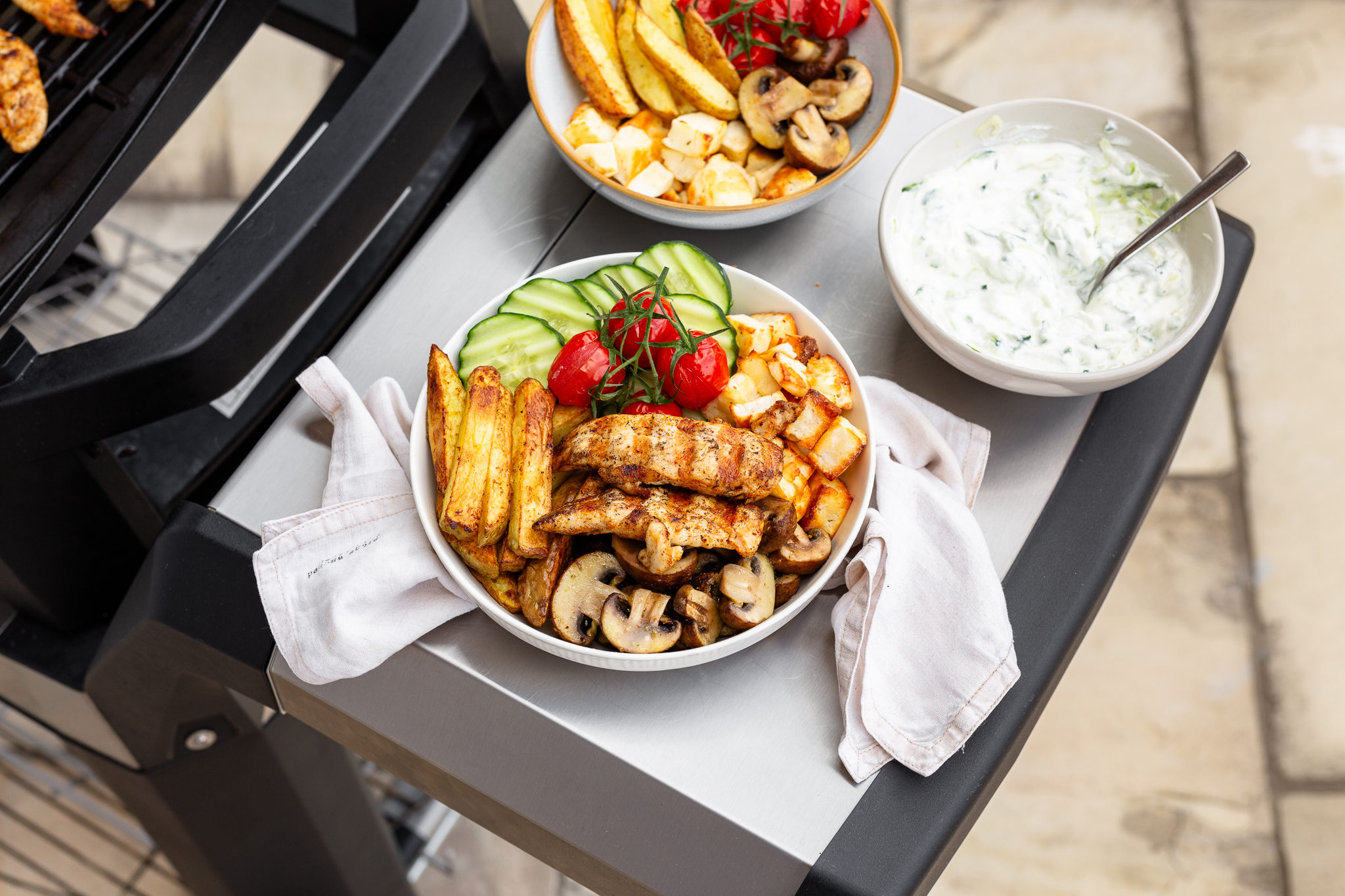 Ich sag’s euch gleich: Hier kommt wirklich alles zusammen. Saftiges Hühnerfleisch, knusprige Kartoffelsticks, gebratener Halloumi, aromatisch gegrilltes Gemüse und natürlich ein cremiges Tzatziki, das das Ganze herrlich frisch abrundet. Eine Bowl, viele Texturen, jede Menge Geschmack.