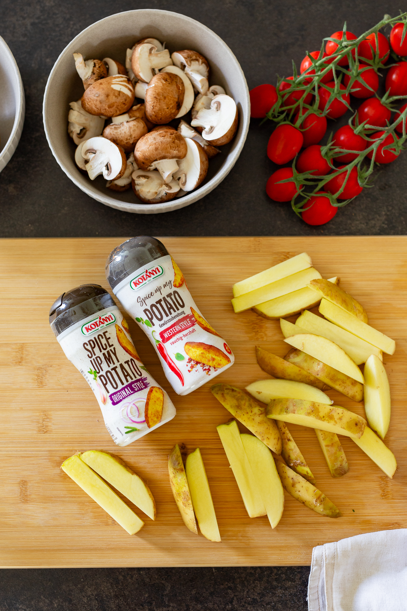 - Kartoffeln in dünne Sticks schneiden, mit Spice up my Potato und Olivenöl vermengen. Im Ofen bei 200 °C (Ober-/Unterhitze) ca. 30–35 Min. knusprig backen oder grillen.