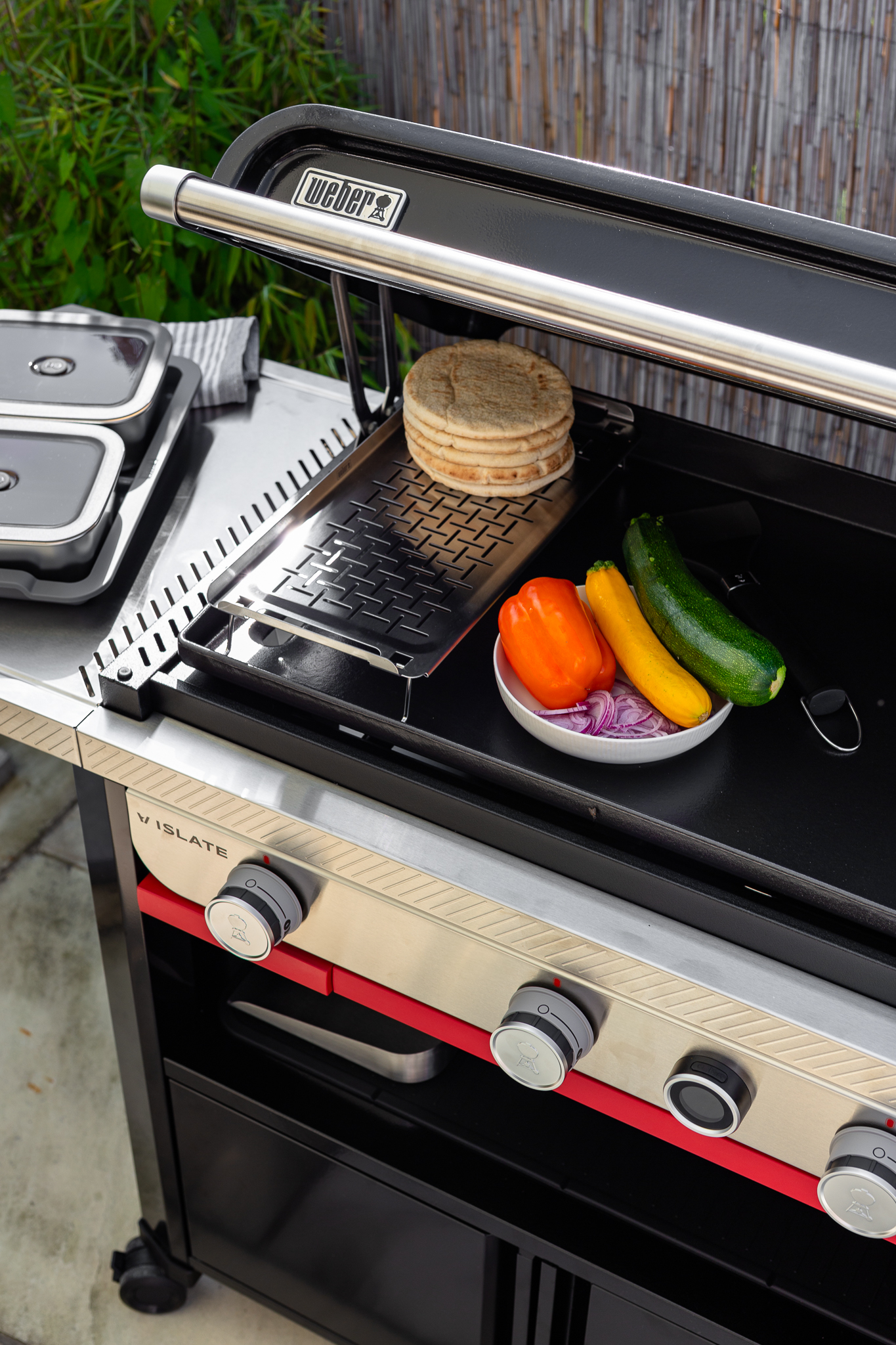 Die Basis ist knusprig gegrillter Karfiol – mariniert mit würzigem Gyros-Gewürz, direkt auf der heißen Plancha vom neuen Weber® SLATE Grill. Und dieser Grill ist wirklich next-level: große Antihaftfläche, digitale Temperaturanzeige, und das ganze Weber Works System macht’s einfach seeeehr praktisch!