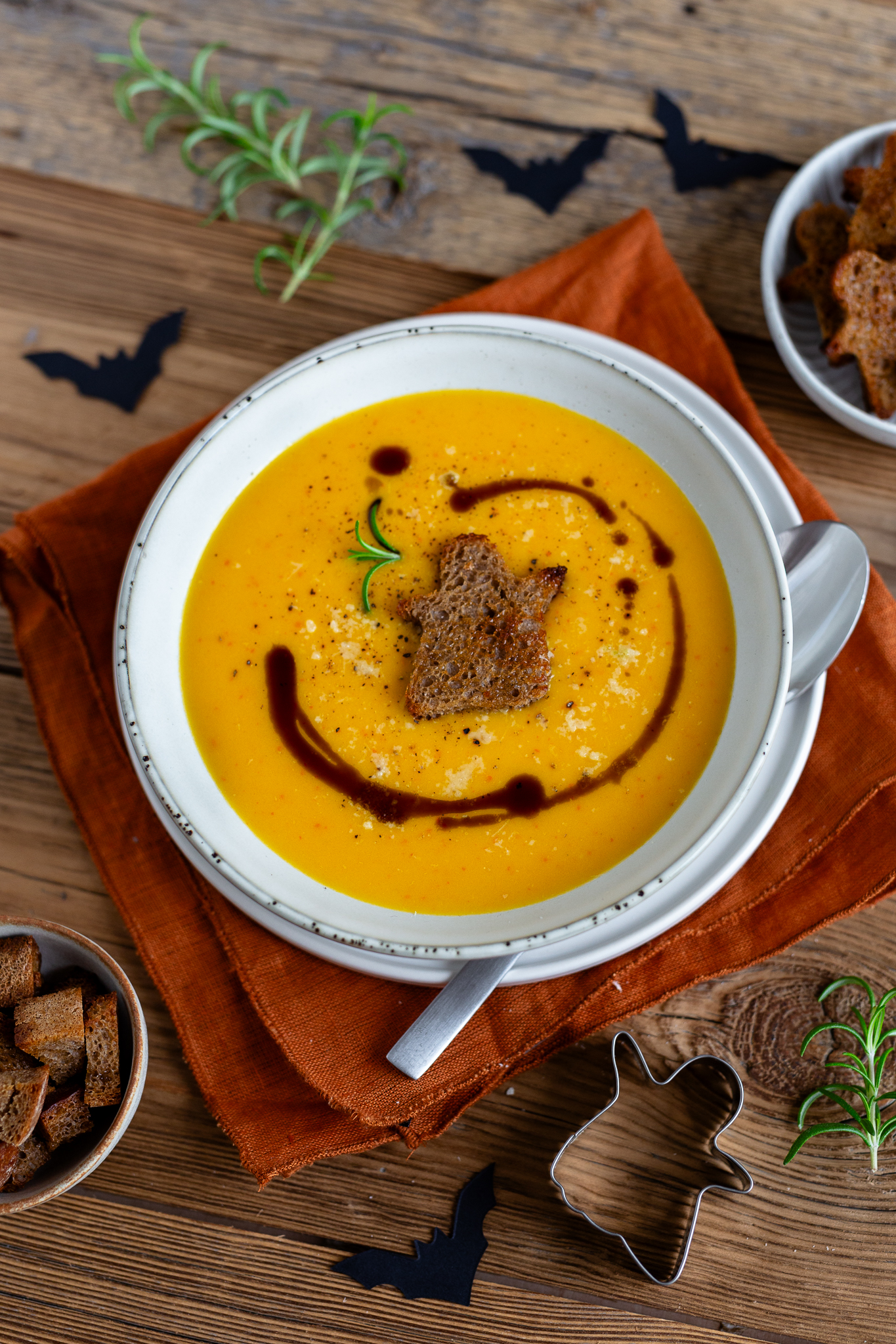 Die Croutons kannst du ganz leicht mit Halloween-Ausstechern zubereiten – ob Geister, Kürbisse oder Fledermäuse, der Fantasie sind keine Grenzen gesetzt. Ein kleiner Tipp: Die Brotreste einfach würfeln, mit Olivenöl beträufeln und als zusätzliche knusprige Einlage mitbacken.