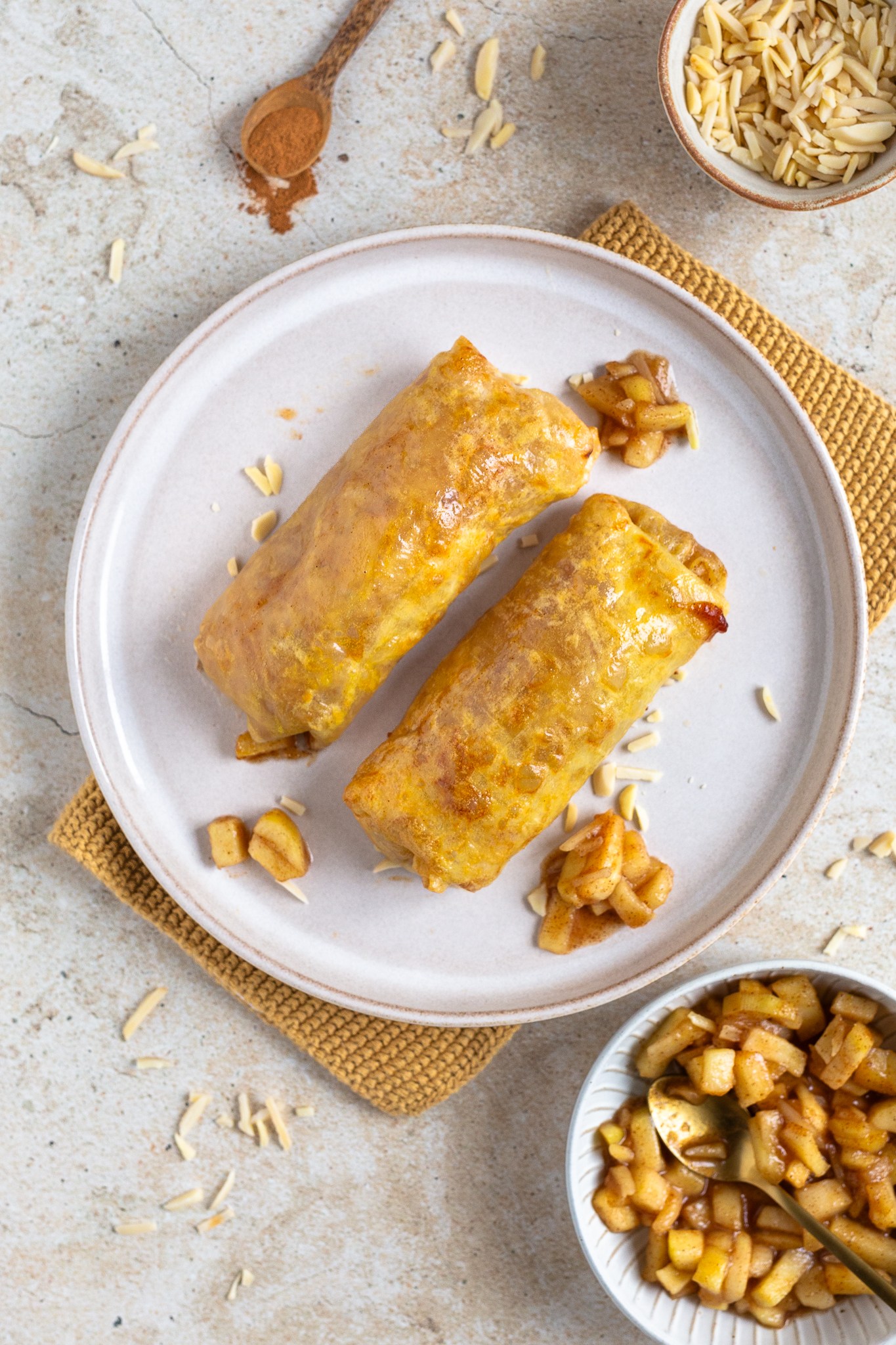 Statt Teig verwende ich Reispapier – eine leichte und überraschend vielseitige Alternative. In der Kombination mit einer cremig-warmen Apfelfüllung entsteht ein Dessert, das an knusprige Apfelstrudel erinnert, aber viel schneller gelingt. Die Füllung aus frischen Äpfeln, Butter, Zimt, Zucker und Mandeln duftet herrlich nach Herbst. Ein Spritzer Zitronensaft bringt Frische ins Spiel, während die Mandeln für Biss und ein nussiges Aroma sorgen.