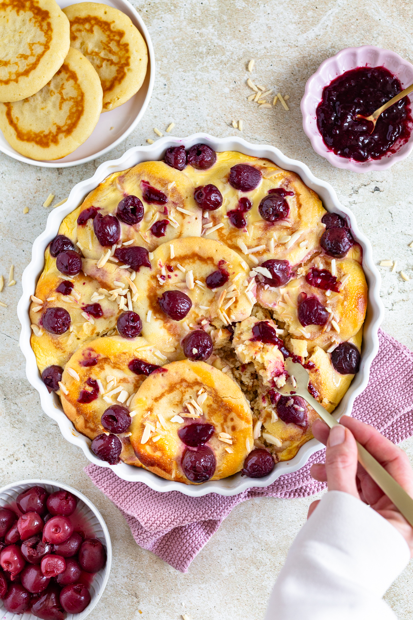 Durch das Schichten der Pancakes mit der Topfenmasse entsteht beim Backen eine Art süßer, saftiger „Breakfast-Lasagne“. Die obere Schicht wird leicht goldbraun, innen bleibt alles fluffig und cremig. Die Kirschen setzen frische, fruchtige Akzente und die Mandelstifte bringen den perfekten Crunch.