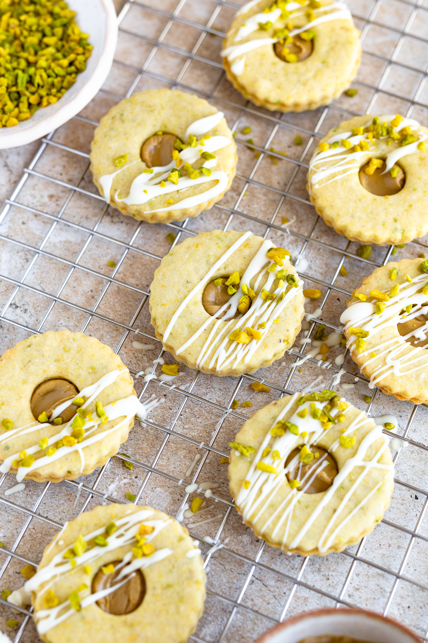 Pistazien verleihen Gebäck eine aromatische, nussige Tiefe, die weder zu süß noch zu schwer ist. In diesen Keksen treffen sie auf einen klassischen Mürbteig, eine zartschmelzende Pistaziencreme und ein knuspriges Finishing aus weißer Schokolade und gehackten Pistazien.