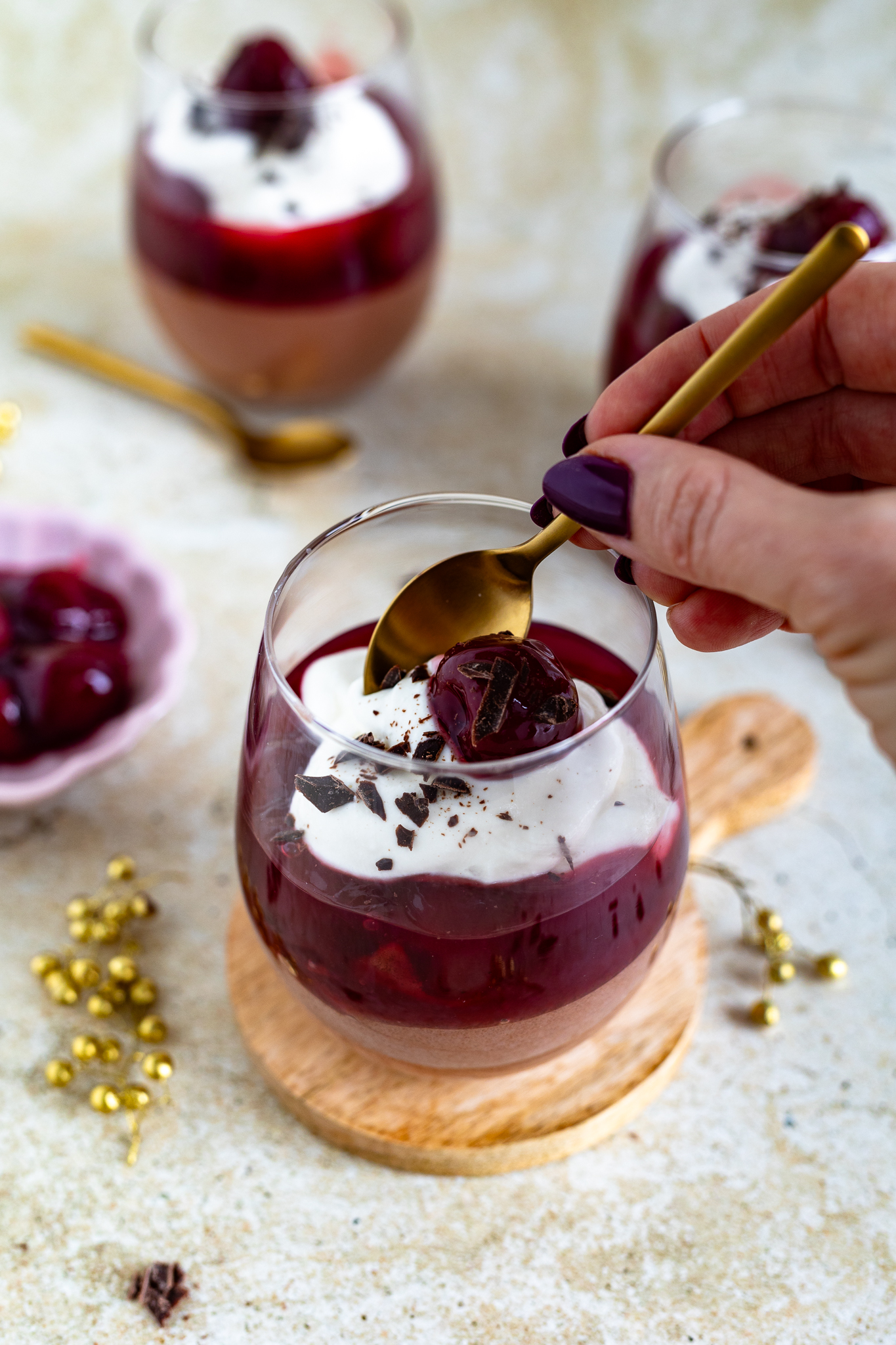 Besonders hübsch wird das Dessert durch die festliche Deko: ein paar gehackte Schokostückchen, eine glänzende Kirsche und schon sieht jedes Glas aus wie ein kleines Kunstwerk, das sich perfekt auf der Weihnachts- oder Silvester-Tafel macht.