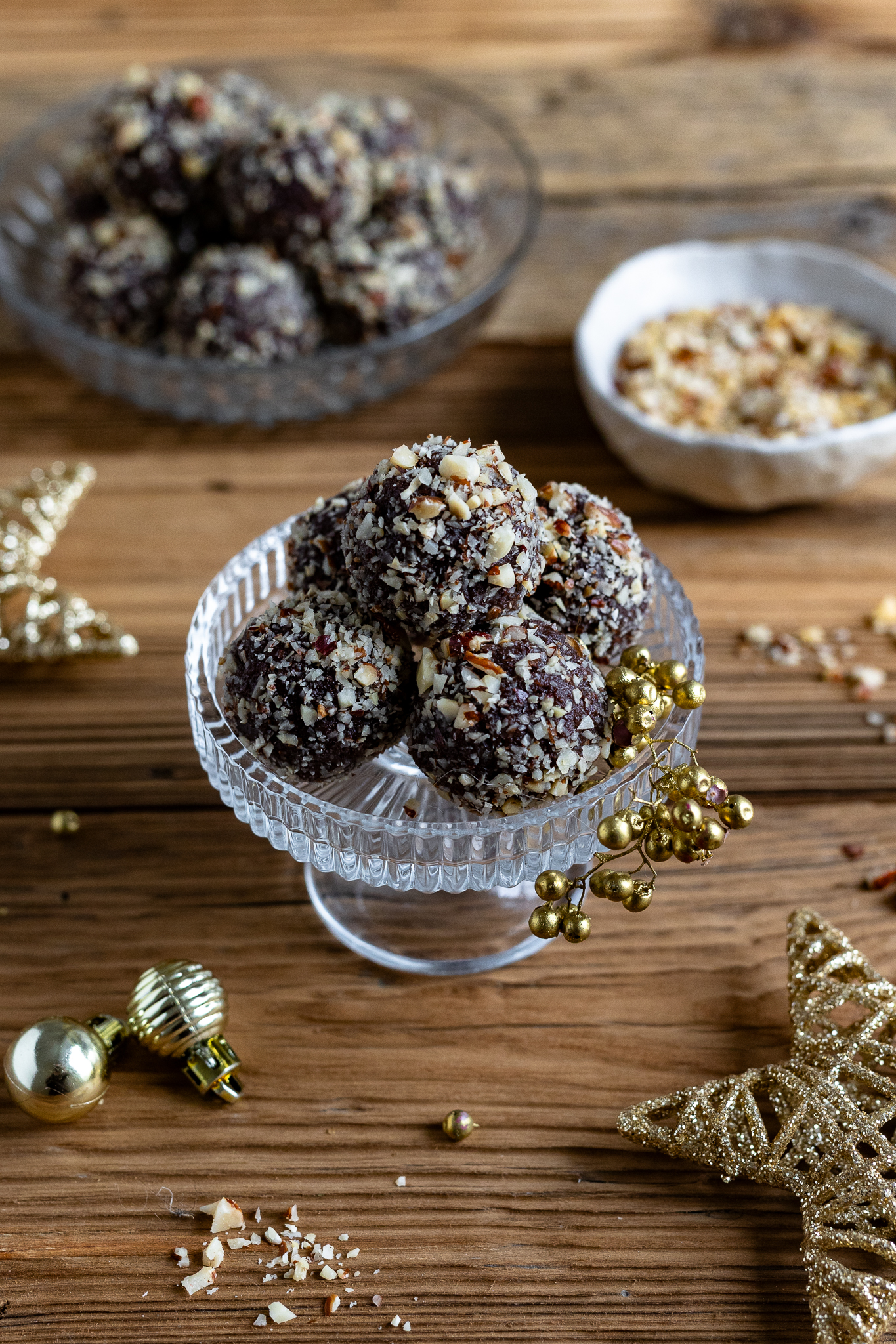 - Kleine Kugeln formen und in gehackten Haselnüssen wälzen.