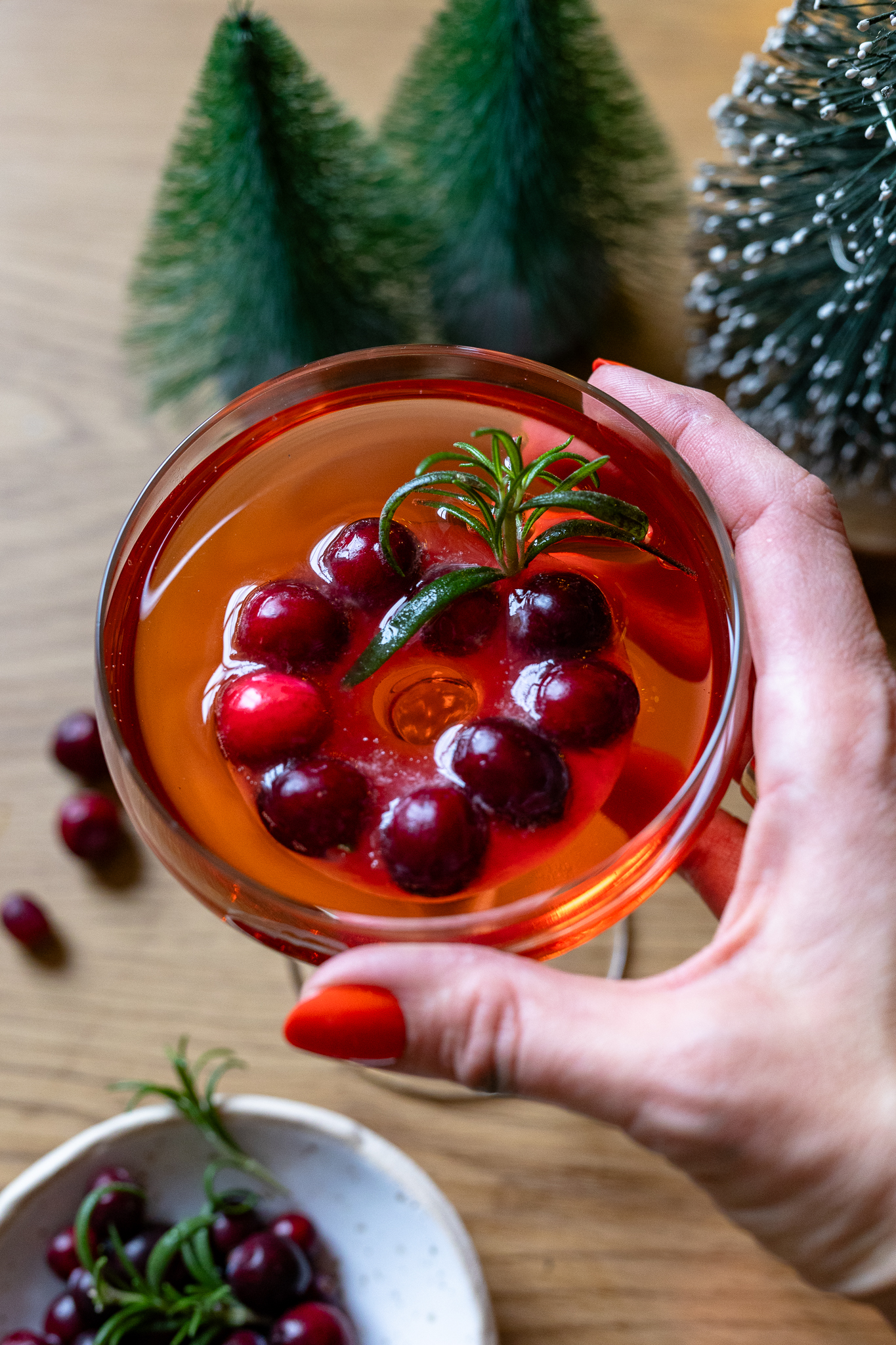 Ein Christmas Aperol Spritz lebt von den kleinen Extras. Für mich unverzichtbar: festliche Eiswürfel. Ein paar Cranberries, etwas Saft und ein Mini-Rosmarinzweig machen aus einem simplen Drink eine richtig schöne Weihnachtskreation.