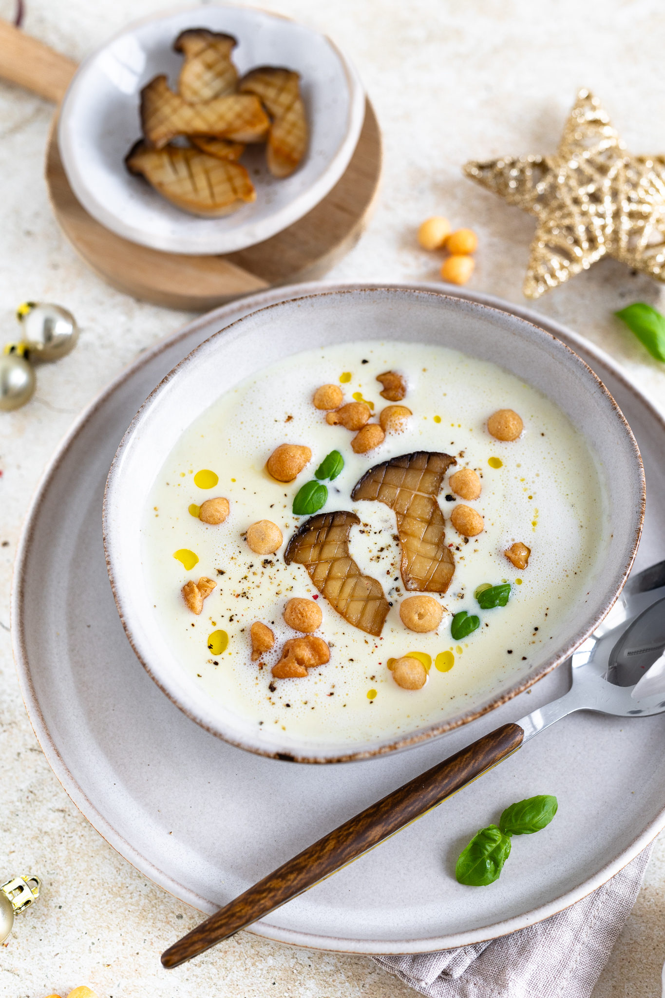 Gerade rund um die Feiertage mag ich Gerichte, die nicht stressen, sich gut vorbereiten lassen und trotzdem schön aussehen. Genau das bringt diese Suppe mit – sie wirkt ruhig, klar und passt perfekt zu einer weihnachtlich gedeckten Tafel, wie man sie auch auf dem Rezeptbild sieht.