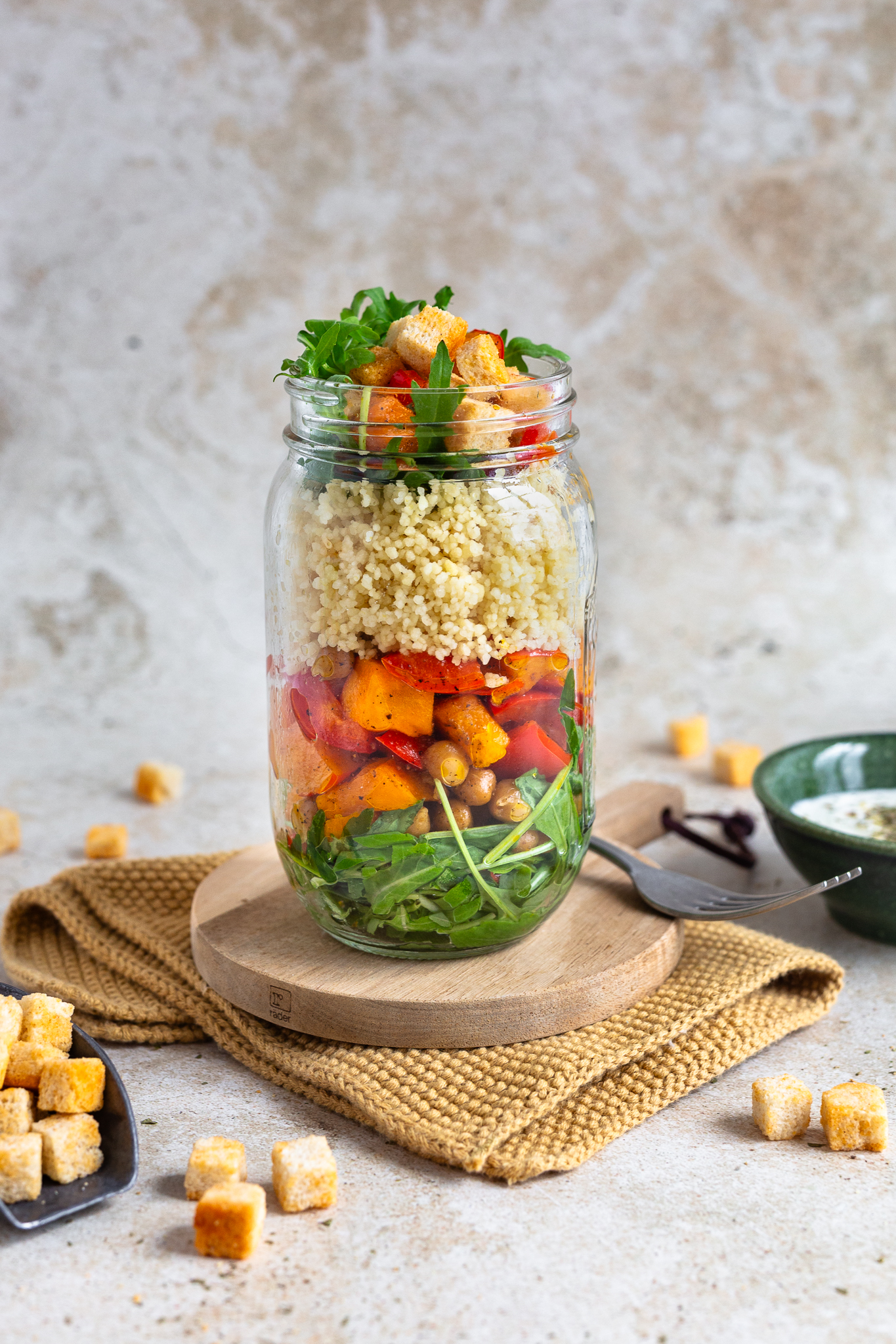 - Schichten im Glas (à 750 ml): Rucola, Ofengemüse und Couscous nacheinander in das Glas schichten. Croutons als Topping verwenden. Salat am Vortag fertig ins Glas schichten. Dressing und Croutons separat mitnehmen.
