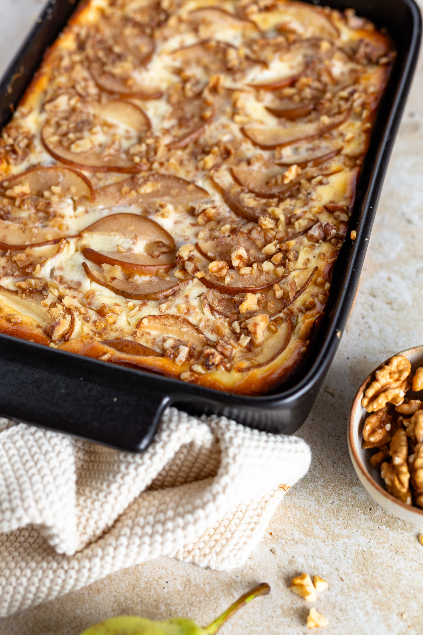 - Den Auflauf mit Birnenscheiben und gehackten Walnüssen toppen.