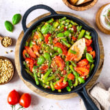 Spargel ggf. waschen und kurz abtropfen lassen. Die holzigen Enden entfernen und in ca. 3cm große Stücke schneiden.Tomaten waschen und vierteln oder klein würfeln.Frühlingszwiebeln putzen und in Ringe schneiden.Knoblauchzehen abziehen.Butter und Olivenöl in einer Pfanne erhitzen. Spargel und Frühlingszwiebeln anrösten. Zucker, Tomatenstücke und vier gepresste Knoblauchzehen zugeben und auf kleiner Flamme für einige Minuten schmoren.Basilikum hacken, Thymian abrebeln, in die Pfanne geben und für ca. 5 Minuten weiterschmoren.Pinienkerne in einer Pfanne ohne Öl anrösten.Die andalusische Spargelpfanne mit Salz und Pfeffer abschmecken. Mit Pinienkernen, gehobeltem Parmesan und frisch gemahlenem schwarzen Pfeffer servieren.Dazu ein knuspriges Baguette reichen.