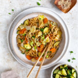Für die Gurkensalatmarinade alle Zutaten verrühren. Salatgurke vierteln, in Stücke schneiden und mit der Marinade vermengen. Salat beiseitestellen und ziehen lassen.Nudeln lt. Packungsanleitung kochen. Abseihen und kalt abspülen.Jungzwiebeln in feine Ringe schneiden. Karotten und Weißkraut in Streifen oder Rauten schneiden. Zucchini halbieren und in Scheiben schneiden.Für die Sauce alle Zutaten miteinander verrühren.Öl in einem Wok oder einer tiefen Pfanne erhitzen. Jungzwiebeln scharf anbraten. Karotten und Weißkraut zugeben und unter ständigem Rühren 3-4 Minuten anrösten. Zucchini in die Pfanne geben und mit der Sauce ablöschen.Nudeln zugeben und weiterem Rühren 2-3 Minuten einreduzieren lassen.Wer mag kann die Nudeln vor dem Servieren mit geröstetem Sesam bestreuen.