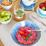Birne waschen, vom Kerngehäuse befreien und grob raspeln. Himbeeren, Joghurt und Milch fein pürieren. Dinkelflocken mit Himbeerjoghurt vermengen. Birnenraspel zugeben und verrühren.Gehackte Mandeln, Leinsamen, Honig und Zimt zugeben, gut durchmischen und z.B. über Nacht im Kühlschrank ziehen lassen. Mit frischen Früchten anrichten! TIPP: Wenn es einmal schneller gehen muss, kann man die Milch erwärmen und die Dinkelflocken darin 30 Minuten quellen lassen.