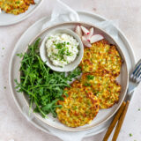 Backofen auf 180 Grad Heißluft vorheizen.Alle Zutaten miteinander verrühren. Ein Backblech mit Backpapier belegen. Mit einem Eisportionierer Kugeln aufs Blech setzen und flach drücken.Im Backofen 20 Minuten knusprig backen.Dazu schmecken ein frischer Salat und Gemüse sowie frischer Cottage Cheese.Mein Tipp: Je nach Saison kann man auch Karotten, Brokkoli, Kürbis usw. anstatt Zucchini verwenden.