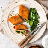 Spinat waschen, abtropfen lassen und grob hacken.Frühlingszwiebeln in Ringe schneiden und den Knoblauch fein würfeln.Öl in einer Pfanne erhitzen, Frühlingszwiebeln und Knoblauch anrösten. Spinat zugeben und weiterbraten, bis der Spinat zusammenfällt. Die Pfanne zur Seite stellen und den Spinat abkühlen lassen.Die Palatschinken mit Kräuterfrischkäse bestreichen, mit Spinat füllen und aufrollen.Die gefüllten Palatschinken jeweils in 4 Rollen schneiden.Nun in Mehl und Ei wenden und anschließend mit Bio Dinkel Semmelbröseln panieren.Öl in der (sauberen Spinat-)Pfanne erhitzen und die Palatschinken Röllchen goldbraun backen.Dazu schmeckt ein leichter Frischkäse oder Joghurt Dip.TIPP: Für noch mehr Geschmack einen Esslöffel getrocknete Kräuter, z.B. Oregano, mit den Bröseln vermischen.