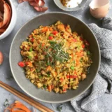 Reis laut Packungsanleitung zubereiten. Abkühlen lassen oder mit kaltem Wasser abspülen. ACHTUNG - es ist wichtig das der Reis KALT ist, bevor ihr ihn zum Braten in die Pfanne gebt, da dieses Gericht ansonsten zu einer matschigen Angelegenheit wird.Zwiebel sowie Knoblauch schälen und fein hacken. Gemüse putzen und in kleine Würfel schneiden. Kichererbsen abseihen und abspülen, Erbsen antauen lassen.Eier aufschlagen, verquirlen und in einer heißen Pfanne (wie ein Rührei) braten und beiseite stellen.Zwiebel in etwas Öl anschwitzen, Karotten, Paprika, Knoblauch zugeben und ebenfalls 2-3 Minuten anrösten.Mit Soja Sauce ablöschen, Currypulver und eine Prise Salz einrühren. Nun das Rührei, Kichererbsen, grüne Erbsen sowie den kalten Reis zugeben und auf kleiner Flamme unter ständigem Rühren braten bis das Gemüse gar ist.