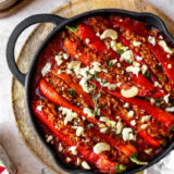 Für die Füllung, Zwiebel sowie Knoblauch abziehen und fein hacken.Olivenöl in einem Topf erhitzen, Zwiebel und Knoblauch goldbraun rösten.Dinkelreis zugeben und für einige Minuten, unter ständigem Rühren, mitbraten.Tomatenmark und Tomatenfruchtfleisch feine Stückchen einrühren.Thymian zugeben und mit Gemüsesuppe aufgießen. Auf kleiner Flamme für ca. 20 Minuten köcheln lassen.Für die Sauce Zwiebel und Knoblauch schälen, fein hacken und in etwas Olivenöl anrösten.Mit passierten Tomaten und Tomatenfruchtfleisch feine Stückchen aufgießen, eine Prise Muskatnuss zugeben und auf kleiner Flamme 15-20 Minuten köcheln lassen.In der Zwischenzeit die Spitzpaprika der Länge nach auf, aber nicht durchschneiden. Kerngehäuse und feine weiße Häute entfernen.Den Backofen auf 180 Grad Heißluft vorheizen.Die Sauce in eine ofenfeste Form geben.Spitzpaprika mit je 3-4 Esslöffel Tomaten-Dinkelreis füllen und in die Sauce legen.Zugedeckt im Backofen für ca. 30 Minuten schmoren. Den Deckel von der Form nehmen, mit Feta-Käse bestreuen und für weitere 5-10 Minuten bei 200 Grad überbacken.Cashewnüsse grob hacken.Die gefüllten Paprika aus dem Backofen nehmen, mit gehackten Cashewnüssen bestreuen und genießen.