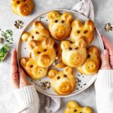 Alle Zutaten zu einem glatten Teig verkneten, zu einer Kugel formen, in Frischhaltefolie verpacken und für 30 Minuten im Kühlschrank ruhen lassen.Den Teig auf einer bemehlten Oberfläche ca. 5mm dick ausrollen. Mit dem größeren Ausstecher/Glas Kreise für die Gesichter ausstechen.Je Schweinchen 2 Kreise mit dem kleinen Ausstecher/Glas für Nase und Ohren ausstechen.Diesen Vorgang solange wiederholen, bis der ganze Teig aufgebraucht ist.Ein Ei zum Bestreichen verquirlen.Die Gesichter auf ein, mit Backpapier belegtes, Backblech legen und mit Ei bepinseln.Backofen auf 160 Grad Heißluft vorheizen.Mit einem Strohhalm in einen kleineren Kreis zwei (Nasen-)löcher stechen und auf das Gesicht legen. Den zweiten kleinen Kreis halbieren und zwei Ohren daraus formen. Das Glücksschweinchen nochmals mit Ei bepinseln.Wiederholen bis alle Glücksschweinchen fertig sind.Nun für ca. 20 Minuten bei 160 Grad Heißluft goldgelb backen.Die Glücksschweinchen aus dem Backofen nehmen und mit einem Strohhalm über der Nase zwei Augen ausstechen und mit Rosinen füllen. Wer die Schweinchen bereits am Vortag zubereitet, sollte sie in einem luftdichten Behälter aufbewahren damit sie saftig bleiben. Frisch schmecken sie am besten.