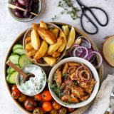 Für das Gyros das Putenfleisch in Streifen oder dünne Scheiben schneiden und mit Kräutern, Gewürzen und Olivenöl marinieren. Das Fleisch mindestens für 2 Stunden im Kühlschrank durchziehen lassen.In der Zwischenzeit die Gurke grob raspeln, salzen und in einem Küchentuch abtropfen lassen. Zum Schluss die Gurkenraspel kräftig ausdrücken, die Flüssigkeit abgießen und in eine Schüssel geben.Gurkenraspel mit Olivenöl, Zitronensaft und Joghurt verrühren. Tsatsiki in den Kühlschrank stellen und kurz vor dem Servieren nochmals mit Salz und Pfeffer abschmecken.Ca. 30 Minuten bevor das Fleisch zubereitet wird den Backofen auf 2oo Grad Heißluft vorheizen. Die Kartoffeln putzen und in viertel Schneiden. Mit Olivenöl sowie einer Prise Meersalz vermengen und anschließend auf ein Backblech mit Backpapier geben.Nun für ca. 20 Minuten goldbraun und knusprig backen.Tsatsiki aus dem Kühlschrank nehmen und abschmecken.Die rote Zwiebel in Ringe schneiden.Für das Gyros eine große Pfanne hoch erhitzen und das Fleisch darin von allen Seiten scharf anbraten. Zwiebelringe zugeben und kurz mitschwenken.Gyros mit Tsatsiki und Ofenkartoffeln anrichten. Wer mag kann dazu Kalamata Oliven, frische Gurkenscheiben und reife Tomaten servieren.