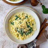 Blattspinat waschen, abtropfen lassen und grob hacken.Zwiebel und Knoblauch schälen und fein würfeln.Emmentaler sowie Parmesan fein reiben.Nudeln in reichlich Salzwasser al dente garen.Olivenöl in einer Pfanne erhitzen, Zwiebel und Knoblauch anbraten. Spinat zugeben und weiterrösten bis der Spinat zusammenfällt.Parallel für die Mehlschwitze die Butter in einem Topf schmelzen, Mehl zugeben und kräftig umrühren. Mit Apfelsaft ablöschen und mit Schlagobers und Milch aufgießen, dabei kräftig rühren damit sich das Mehl auflösen kann und keine Klumpen entstehen.Geriebenen Käse und eine Prise Muskatnuss zugeben und unter ständigem Rühren schmelzen lassen.Nudeln abgießen, aber ACHTUNG unbedingt 2 EL Nudelwasser in die Käsesauce einrühren 🙂, und zurück in den Topf geben.Spinat und Käsesauce zugeben und noch einmal aufkochen lassen.Mit Salz und Pfeffer abschmecken und Servieren.