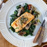 Zwiebel sowie Knoblauch schälen und fein würfeln.Spinat waschen und grob schneiden.Champignons putzen und halbieren oder vierteln.Getrocknete Tomaten in Streifen schneiden.Sonnenblumenöl in einer Pfanne erhitzen, Lachsfielt trocken tupfen mit Salz sowie Pfeffer würzen und für ca. 2-3 Minuten auf jeder Seite anbraten.Lachsfilet aus der Pfanne nehmen und zugedeckt beiseitestellen.Öl der getrockneten Tomaten in die Pfanne geben, Zwiebel sowie Knoblauch darin goldbraun anrösten.Getrocknete Tomaten, Champignons sowie Spinat zugeben und bei mittlerer Hitze weiterbraten bis der Spinat zusammenfällt.Gemüse in eine ofenfeste Form geben und die Lachsfilets darauf platzieren.Backofen auf 180 Grad Ober-/Unterhitze vorheizen.Thymianstiele, Schlagobers und 100g Parmesan in die Pfanne geben und unter ständigem Rühren für 1-2 Minuten kochen lassen.Einen Esslöffel Zitronensaft in die Sauce geben und anschließend über den Lachs sowie das Gemüse gießen.Die Auflaufform in den Backofen stellen und für ca. 10-15 Minuten fertig garen.