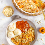 Rezept für einen saftigen Marillen Crumble mit Mandeln. Dazu schmeckt cremiges Vanilleeis! Gutes Gelingen!