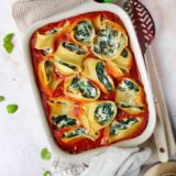 Muschelnudeln in reichlich Salzwasser bissfest garen, abseihen und beiseitestellen.Zwiebeln und Knoblauch abziehen und klein würfeln.1 EL Olivenöl in einem Topf erhitzen, die Hälfte der gewürfelten Zwiebeln sowie Knoblauchzehen darin anrösten.Tomatenmark zugeben und für 1-2 Minuten weiterrösten. Mit Pomìto passierten BIO Tomaten ablöschen und mit den Tomatenstücken aufgießen.Oregano zugeben und auf kleiner Flamme ca. 10 Minuten köcheln lassen.Nun den Spinat waschen, gut abtropfen lassen, gegebenenfalls in der Salatschleuder trockenschleudern und anschließend grob hacken.Öl in einer Pfanne erhitzen, die restlichen Zwiebel- und Knoblauchwürfel goldbraun anrösten.Den Spinat portionsweise in die Pfanne geben und unter ständigem Rühren braten bis er zusammenfällt.Frischkäse in die Pfanne geben und auf kleiner Flamme schmelzen lassen.Die Spinatmasse etwas abkühlen lassen.Den Backofen auf 200 Grad vorheizen.Die Tomatensauce in eine ofenfeste Auflaufform Form füllen, die vorgekochten Nudeln mit der Spinat-Frischkäse-Masse füllen und in die Auflaufform schichten.Auflaufform abdecken und für ca. 25 Minuten im Backofen backen.Vor dem Servieren mit frischem Parmesan bestreuen.