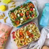 Jausebox für hungrige Tiger! Nudelsalat mit Gemüse, Mozzarella und einem leichten Joghurt Dressing. Dazu trinken wir ein erfrischendes Zitronen-Minze-Wasser.
