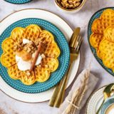 Kürbispürree mit allen weiteren flüssigen Zutaten verrühren. Mehl und Backpulver vermengen und zügig einrühren.Waffeleisen auf mittlere Hitze vorheizen.Die Waffeln portionsweise knusprig backen und auf einem Kuchengitter abkühlen lassen oder lauwarm serverien.In der Zwischenzeit die Walnüsse grob hacken. Honig ein einer kleinen Pfanne erwärmen, Walnüsse zugeben und leicht karamellisieren lassen.Frischkäse mit Zimt und Orangensaft glattrühren.Die Kürbis Waffeln mit Honig Walnüssen und Zimt Frischkäse servieren.