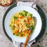 Für die Gemüsesuppe das Gemüse schälen und klein schneiden. Die Gemüsebrühe aufsetzen und auf kleiner Flamme köcheln lassen.Mehl, Eier und Salz in eine Schüssel geben und mit den Händen kneten bis ein glatter und sehr fester Teig entsteht. Wenn der Teig zu bröslig ist, 1-2 EL Wasser zugeben.Die Arbeitsfläche mit Mehl bestäuben. Den Teig mit Hilfe einer Raspel grob raspeln, in Mehl wenden und ca. 30 Minuten trocknen lassen.Anschließend in die Suppe geben und ca. 5 -7 Minuten kochen lassen.
