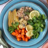 Für das Dressing alle Zutaten miteinander verrühren und in den Kühlschrank stellen.Dinkelreis in reichlich Salzwasser ca. 25 Minuten garen.Backrohr auf 200 Grad Heißluft vorheizen.Die Süßkartoffel schälen und in kleine Würfel schneiden. Öl, eine gepresste Knoblauchzehe, Paprikapulver sowie Salz verrühren und die Süßkartoffel darin schwenken. Die Würfel auf ein, mit Backpapier belegtes, Blech geben und ca. 15-20 Minuten backen.In der Zwischenzeit den Ziegenweichkäse und die Birnen in Scheiben schneiden.Fünf Minuten vor Ende der Backzeit den Ziegenweichkäse zu den Süßkartoffeln aufs Blech geben.Vogerlsalat kalt abspülen und nach Möglichkeit in einer Salatschleuder trocken schleudern.Den Dinkelreis abseihen und kurz heiß abspülen. Süßkartoffel und Ziegenkäse aus dem Rohr nehmen.Nun werden alle Zutaten rasch in meiner hübschen Lumaca Bowl von Mäser angerichtet. Großzügig mit Kürbiskernen sowie Sesam bestreuen und abschließend mit Hummus und dem Dressing toppen.