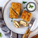 Vollkornbrösel und Mehl in je einen Suppenteller füllen. Eier, Milch und eine Prise Salz ebenfalls in einen tiefen Teller geben und verquirlen.Zucchini waschen, die Enden abschneiden und der Länge nach in ca. 5mm dicke Scheiben schneiden.Je eine Scheibe Käse und Schinken zwischen zwei Zucchini Scheiben legen.Zucchini Cordon Bleu in Mehl wälzen, danach in der Ei Mischung schwenken und abschließend mit Vollkornbrösel panieren. Die Brösel dabei gut festdrücken.Öl in einer großen Pfanne erhitzen und bei mittlerer Hitze goldbraun backen.Dazu schmeckt ein frischer Joghurt-Schnittlauch-Dip und/oder Preiselbeermarmelade.