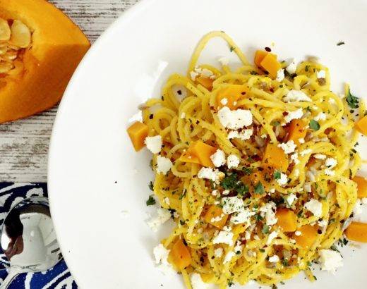 Heute hatten wir mal Lust auf Pasta und passend zur Jahreszeit hab ich sie heute mal mit Kürbis verfeinert! Geht schnell & schmeckt allen – da es auch vegan oder