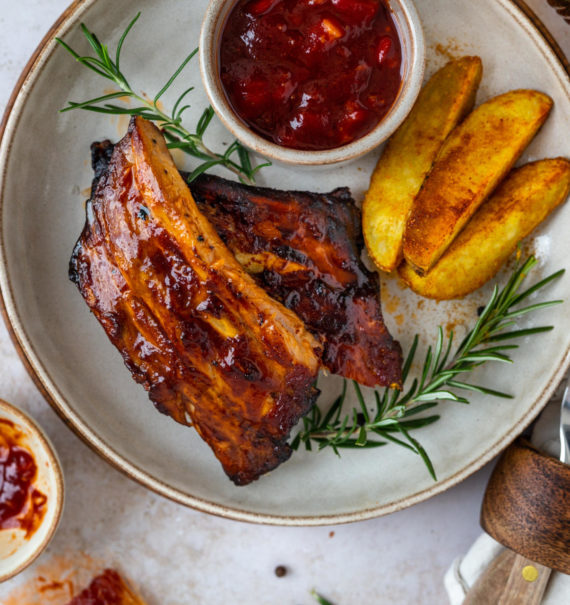 Knusprig, saftig, würzig so kommen meine Spareribs mit Curry-Rosmarin-Kartoffeln aus dem Backofen. Dazu gibts eine kräftige Sauce mit Paprika zum tunken!