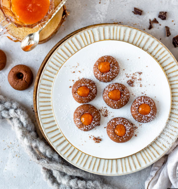 Kakao-Engelsaugen mit einer fruchtigen Marillenmarmelade Füllung! Wie nennst du die kleinen kugelrunden Leckerbissen? Wir nennen sie liebevoll Engelsaugen und sie werden traditionell mit hellem Mürbeteig gebacken und mit Preiselbeergelee gefüllt.